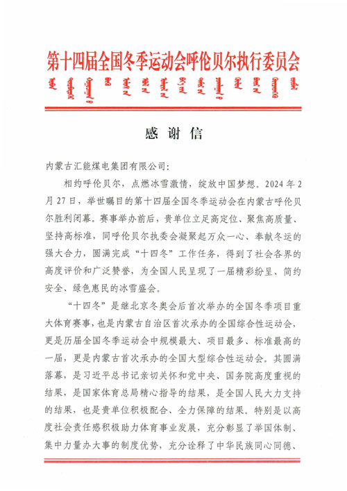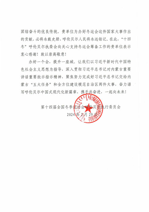 相約呼倫貝爾,點燃冰雪激情,綻放中國夢想。2024年2 月27日,舉世矚目的第十四屆全國冬季運動會在內(nèi)蒙古呼倫貝 爾勝利閉幕。賽事舉辦前后,貴單位立足高定位、聚焦高質(zhì)量、 堅持高標準,同呼倫貝爾執(zhí)委會凝聚起萬眾一心、奉獻冬運的 強大合力,圓滿完成“十四冬”工作任務(wù),得到了社會各界的 高度評價和廣泛贊譽,為全國人民呈現(xiàn)了一屆精彩紛呈、簡約 安全、綠色惠民的冰雪盛會。